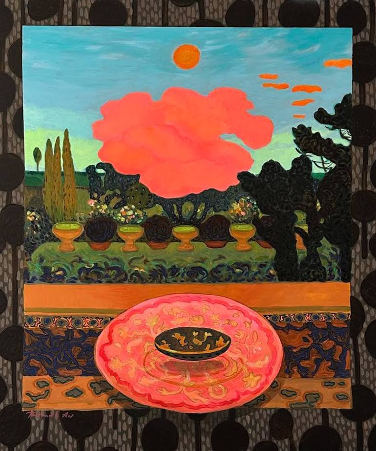 I immerse the viewer in a world of fantasy and imagination. At the center of attention is a large round platter painted in shades of pink and gold, adorned with an intricate pattern that symbolizes wealth and abundance. The platter rests on a table with a design in blue and brown hues, creating a se...