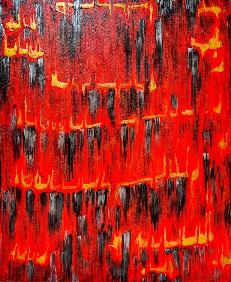 Secret is a vivid and enigmatic exploration of language, symbolism, and inner descent. Painted in deep reds, scorched blacks, and fiery golds, the composition evokes an infernal rhythm—structured yet chaotic—like coded messages lost in flames. The golden symbols seem to form a forgotten script, an i...