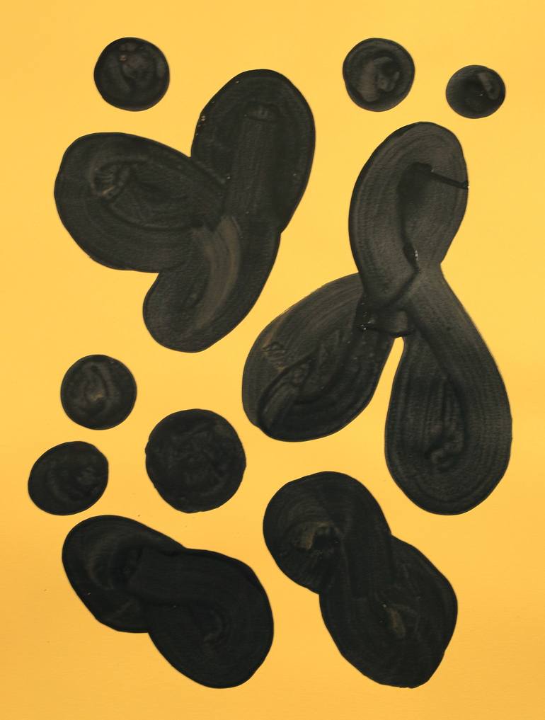 Organic shapes rendered with ink and brush on gold paper. I employ patterns in mixed medial that draw on my fascination with plant and animal forms and symbiosis.