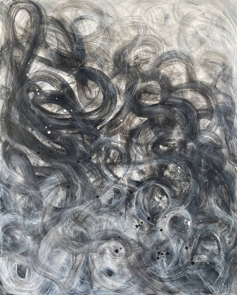 It is an evocative abstract painting created by using only the movement of brushes and different tones, rendered entirely in black and white color. This visually engaging piece evokes a dynamic and tumultuous strokes reminiscent of a smoky-hazy-entangled situation. The interplay of black and white...