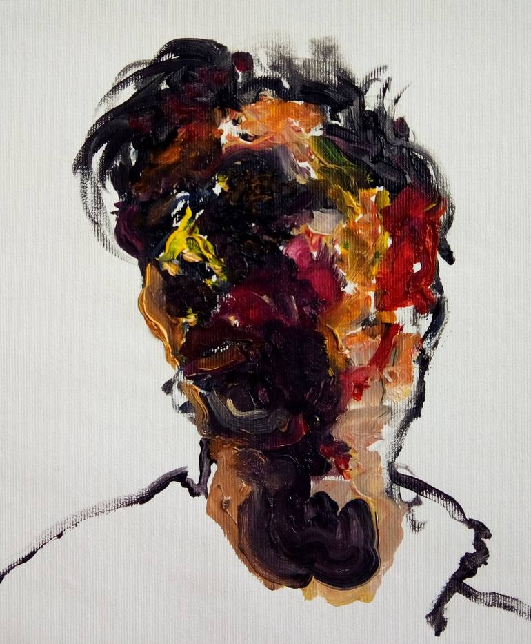 Painting is oil on canvas. It shows an self-portrait in impasto style.