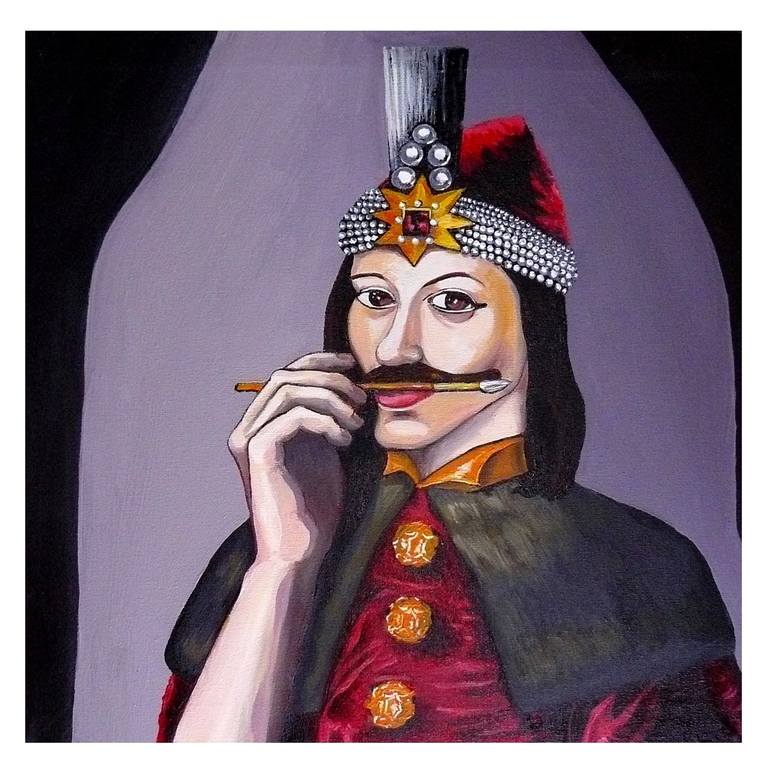 My family name is Vlad , like Vlad Tepes ,the romanian king that inspired Bram Stoker's Dracula . I made a connection between my portrait and a painted portrait of him . I chose a recent picture of myself , which was appreciated, but ,also criticized for the erotic gesture of holding a paint brush ...