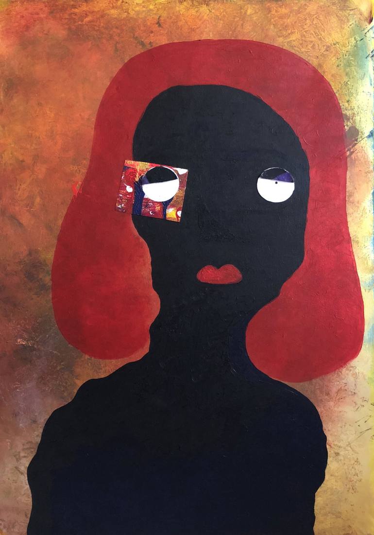 In my process I combine both the unconscious and the conscious state of mind and improvisation is an important part of it because this is the way I initiate every work. In the beginning my focus is on enjoying my own performance and my interaction with colour, creating shapes and making marks without thinking, using different tools or hands intuitively. I believe in accidents and most of the time I let them modify me and my work. I allow myself to make mistakes and I don’t position myself between fixed ideas. Later in the process I act consciously and respond with clarity to what is already on the canvas by adding new elements, to build and define the theme and the subject. I work predominantly with acrylics and I do sometimes collage. I draw inspiration from my own reality and experiences by going between past and present.