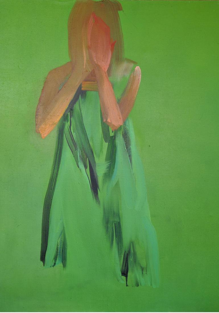 Oil painting - self portrait with covered face. The part of diploma artwork on Academy of Fine Arts Warsaw at 2009. It depict myself in the moment before difficult exam, the most important one - I thought that time... The artwork shows figure of a female with a covered face by hands in a gesture e...