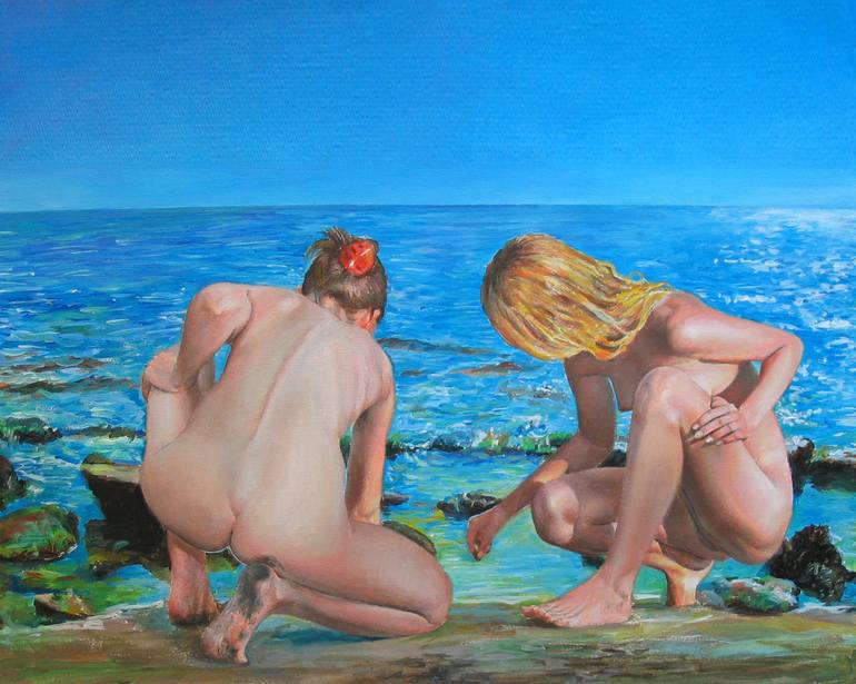 In this artwork, two selkies, mythological beings capable of transforming from seals into humans, having transformed from their seal forms, explore the human world for the first time. The azure expanse of the ocean behind them symbolizes their natural habitat, a realm of fluidity and enigma. The roc...