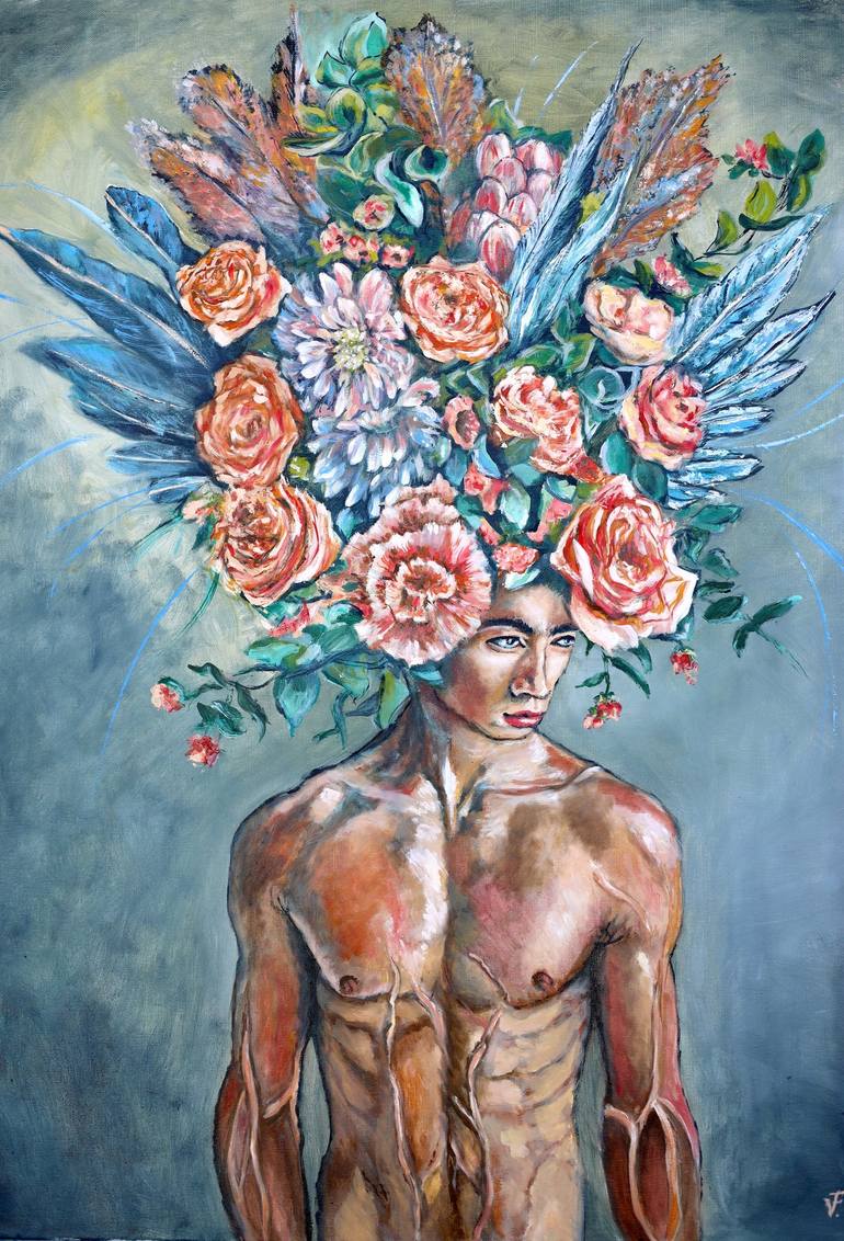 In my work, I wanted to explore the evocative power of nature and the innate beauty of the human being. I chose oil as a medium for its richness and depth, allowing the colors to blend so that every petal and shade of skin stood out with intensity. The main subject, a figure with an explosion of flo...