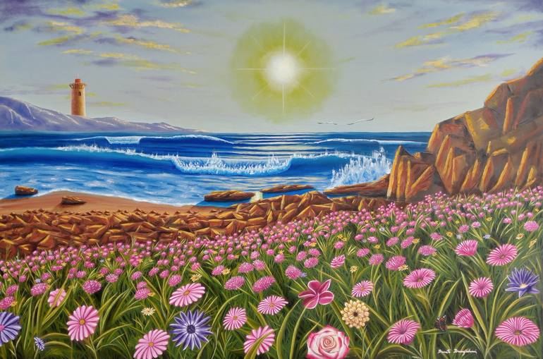 Questo dipinto realizzato ad acrilico nel 2014 rappresenta un luogo in cui avrei voluto essere in quel periodo forse perché inconsciamente avevo voglia di evadere andando in un posto che mi avrebbe dato serenità. Ecco perché ho immaginato questo paesaggio in cui sono presenti il mare, la spiaggia, ...