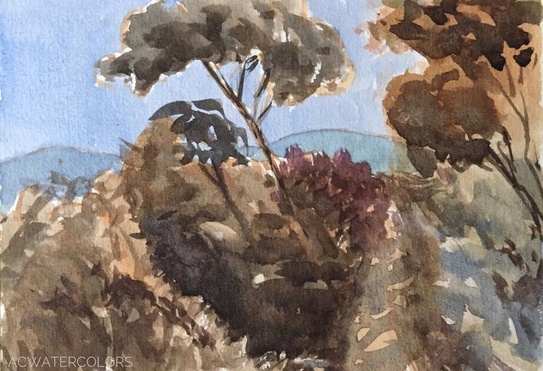 Path in the area of Nice, French riviera, Provence. 15x21cm (6x8.2in), 2021. Winsor & Newton watercolors on Archival Quality 100% cellulose paper. Paint directly in watercolors (no graphite under-sketch). Painted using a limited palette : mainly Cobalt Blue and Burnt Sienna (plus some shade of ultr...