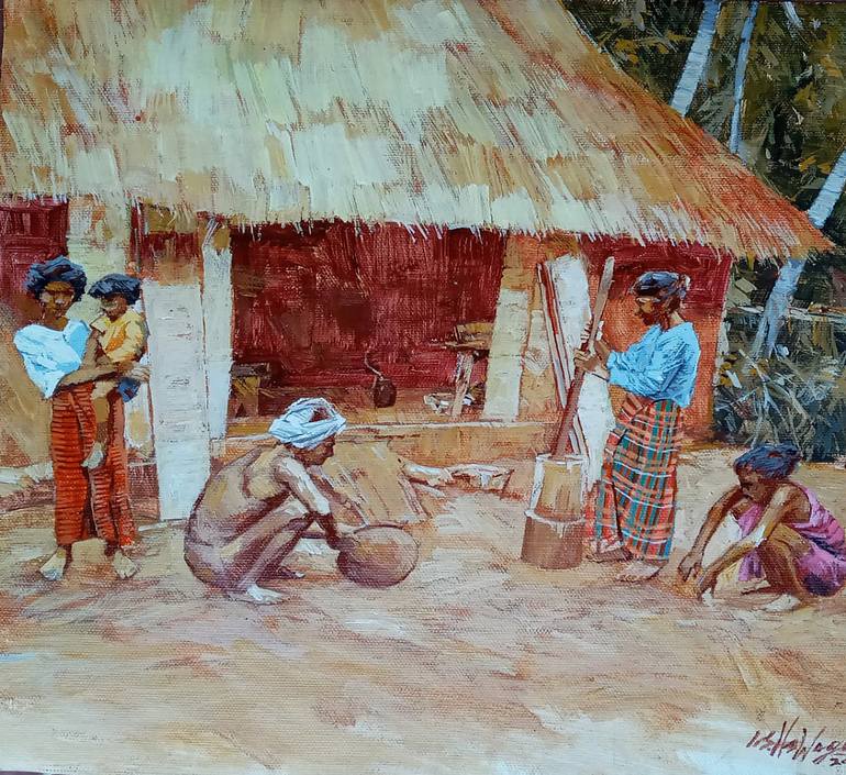The artist has captured a moment in time… it's a busy day in this home, an older lady is seen making flour using a mortar and pestle, a man is seen sifting the grain… The young girl is seen carrying her little brother… A time when life was simpler and calmer. A beautiful painting. * Professionally ...