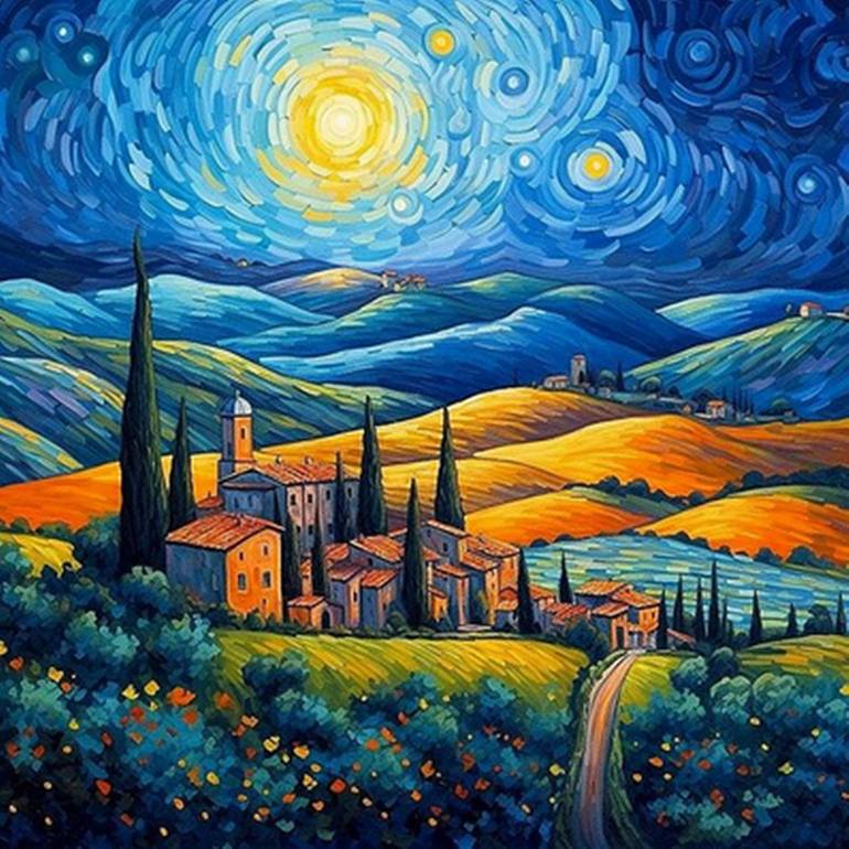 Luminous Euphoria: A Vibrant Countryside Oil Painting Immerse yourself in the radiant beauty of ‘Luminous Euphoria,’ a stunning oil painting that captures the essence of a picturesque countryside. This 100 cm x 100 cm masterpiece features a mesmerizing swirl of celestial blues that dance around a ...