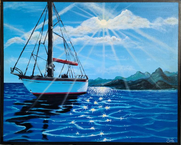 "Serene Sail captures the tranquil beauty of a solitary sailboat gliding through the crystal-clear waters beneath a radiant sky. The sun casts a brilliant glow, creating shimmering reflections on the waves and highlighting the majestic mountains in the distance. This piece embodies the serene allure...