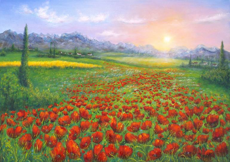 - Colorful sunrise on red flower meadow is a landscape painting on a stretched canvas, it is painted using high quality oil colors, no frame required, ready to hang. -The sides of the canvas have been painted and it is a continuation of the painting. The painting is finished with coats of varnish wh...