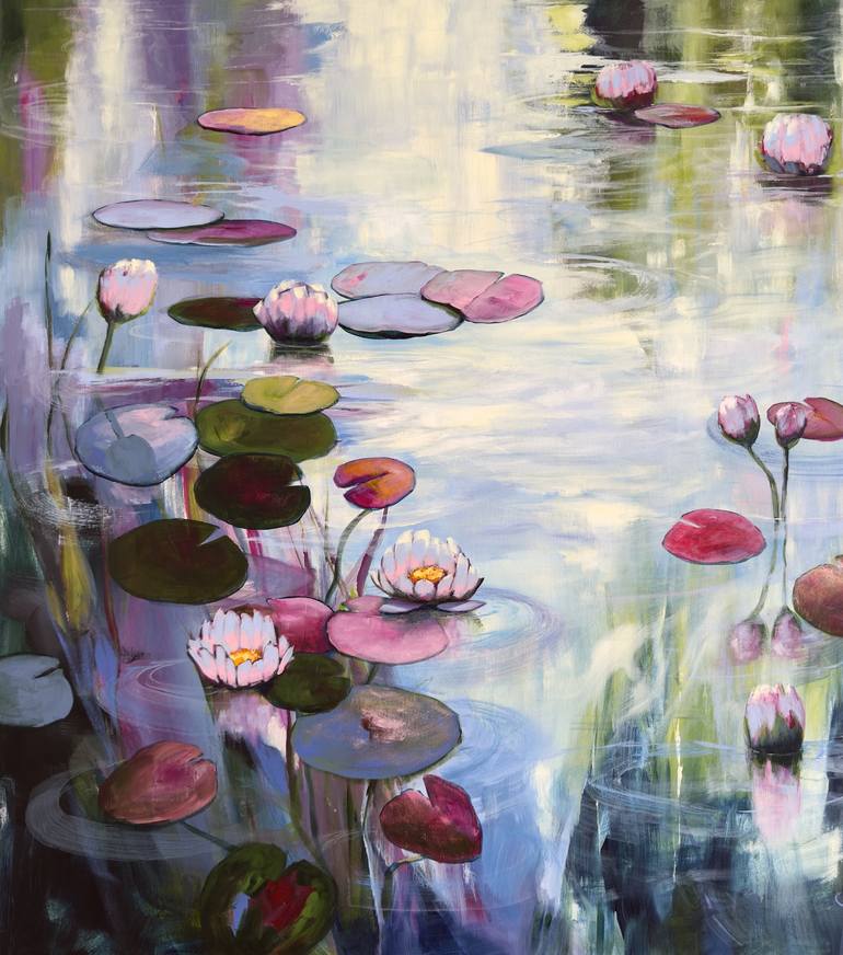 To be at a pond is always a great pleasure. The sunlight reflects here and there in the light blue shining water. The green leaves and pink waterlilies are slowly floating. Happy. Original acrylic painting on stretched canvas. The painting will be send with a Certificate of Authenticity. It is sig...