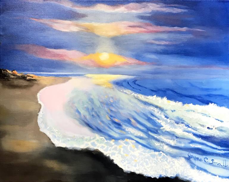 I love the ocean, beaches, and sunsets. It reminds me of the Great Mother. A sunset reminds me of the peaceful end of another day. I am inspired by many hues of sunsets, and of the many different cloud formations. When I see a painting of the sea, it makes me nostalgic for my favorite place, Maui....