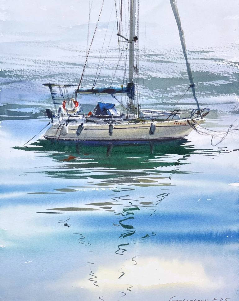 The artist has skillfully portrayed a serene harbor scene, where a sailboat floats gracefully on rippling waters. The watercolor technique emphasizes the fluidity of the sea, while the soft tones reflect the peaceful atmosphere of the setting. Every detail of the boat and its reflection is captured ...