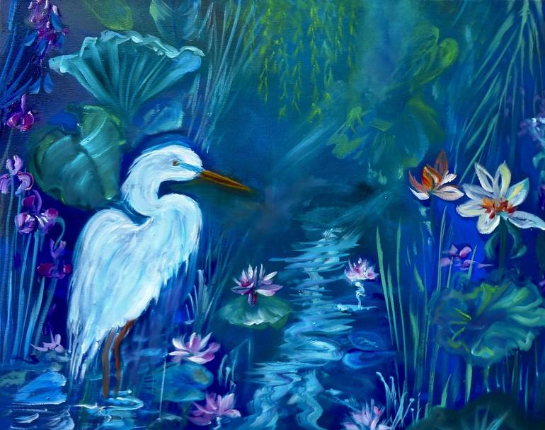 Soft serene swirling colors and calm waters evoke a sense of peace in my mind and love the soft white feathers of this egret foraging in the pond surrounded by green lush forest plants. This painting comes with a certificate of authenticity signed by the artist. Original oil painting on stretched...