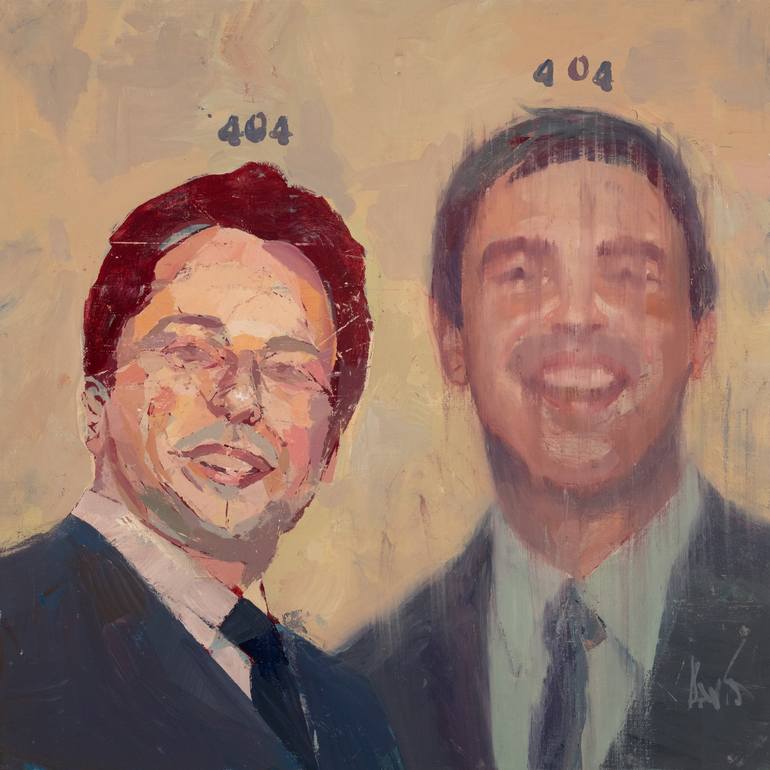 The work is inspired by a 2004 photograph in which Google founders Sergey Brin and Larry Page smile before a press conference at the Frankfurt Book Fair. The “404” references the HTTP error code for a page not found, evoking broken links and structural absences within digital networks. The portrait ...