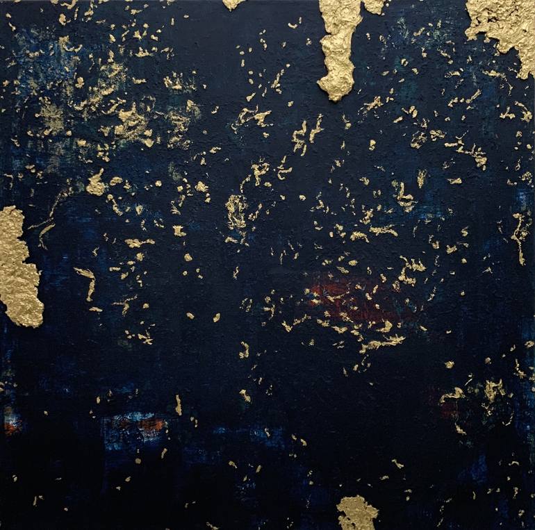 This painting is made using acrylic and metal pigments which give a great gold nugget feel around the edges. The deep indigo along with a settle hint of red adds to the mystery of this artwork