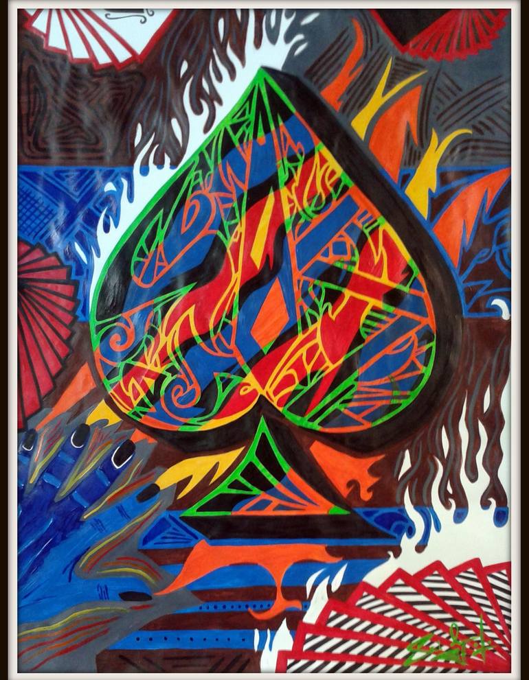 This is a visual treat for the eyes with so many patterns and colors in play. The spade captures the attention of the viewer with its several intricate designs and details. The acrylic colors provide a blend of vibrant texture to the work. This work is as abstract as it gets, there is no real concep...