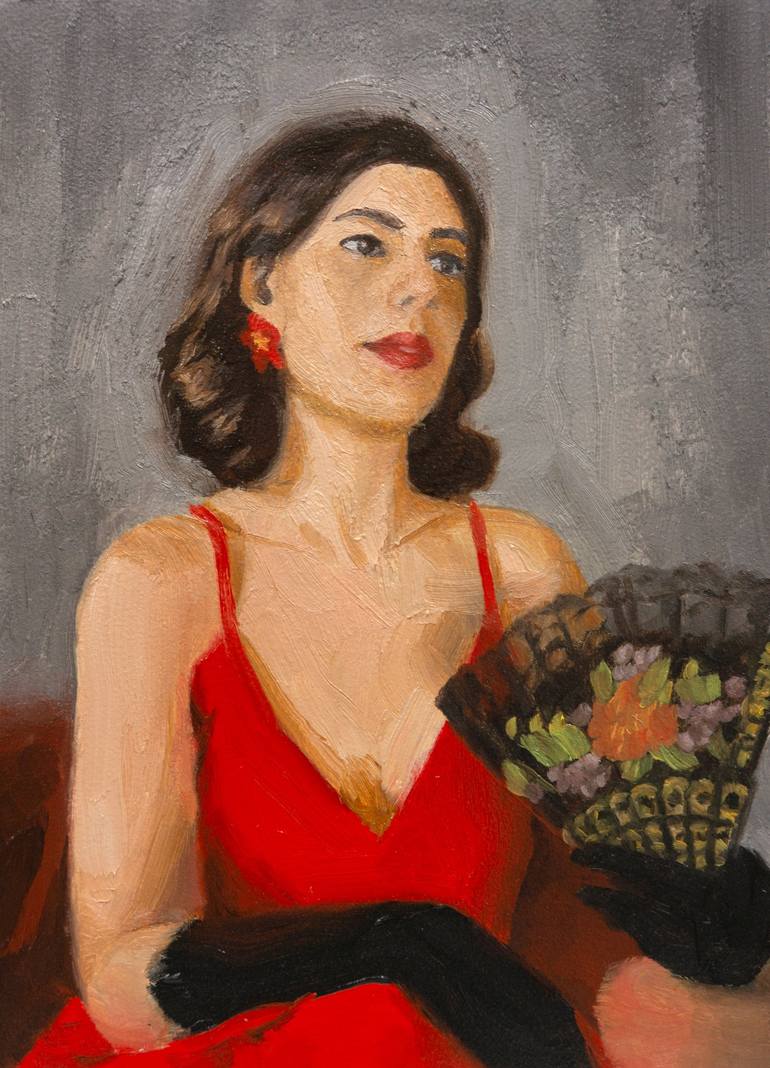 This painting was created by painting the model, Shadia, online. While she was posing, her nosey cat came over and was in view next to her for a while to get in on the action. Shadia chose the pose herself, which I think worked very well for the painting. Sometimes, the best poses come by just lett...