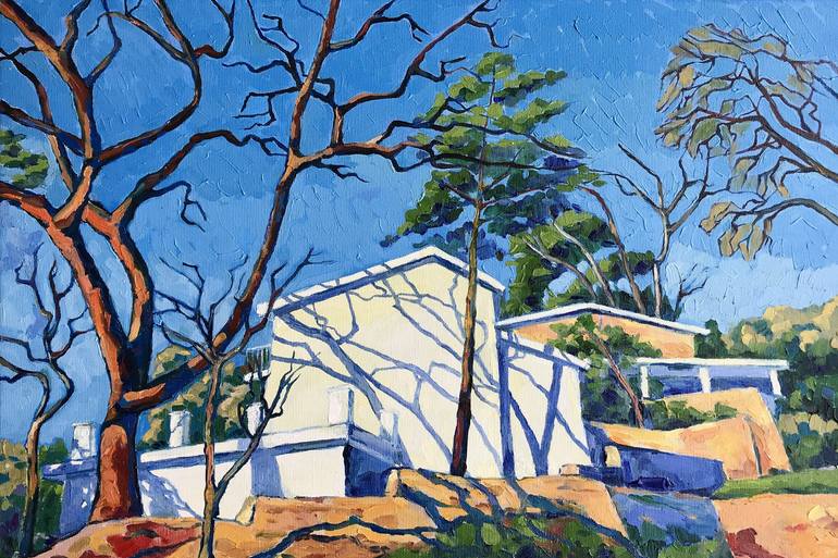 Sunny winter day. Against the background of a dazzling sky and the color of bright turquoise, everything around becomes especially expressive: the white walls of houses, the tiled roofs, and the crowns of tall pine trees, swaying like masts. The main motive that inspired me to paint this artwork is ...