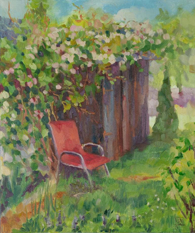 In this painting, I work with oil paint, creating a soft, vibrant texture and a lively interplay of light and shadow. The compositional center of the painting is a garden chair surrounded by blooming clematis — a symbol of rest and relaxation in nature. As if abandoned for a moment, it becomes a me...