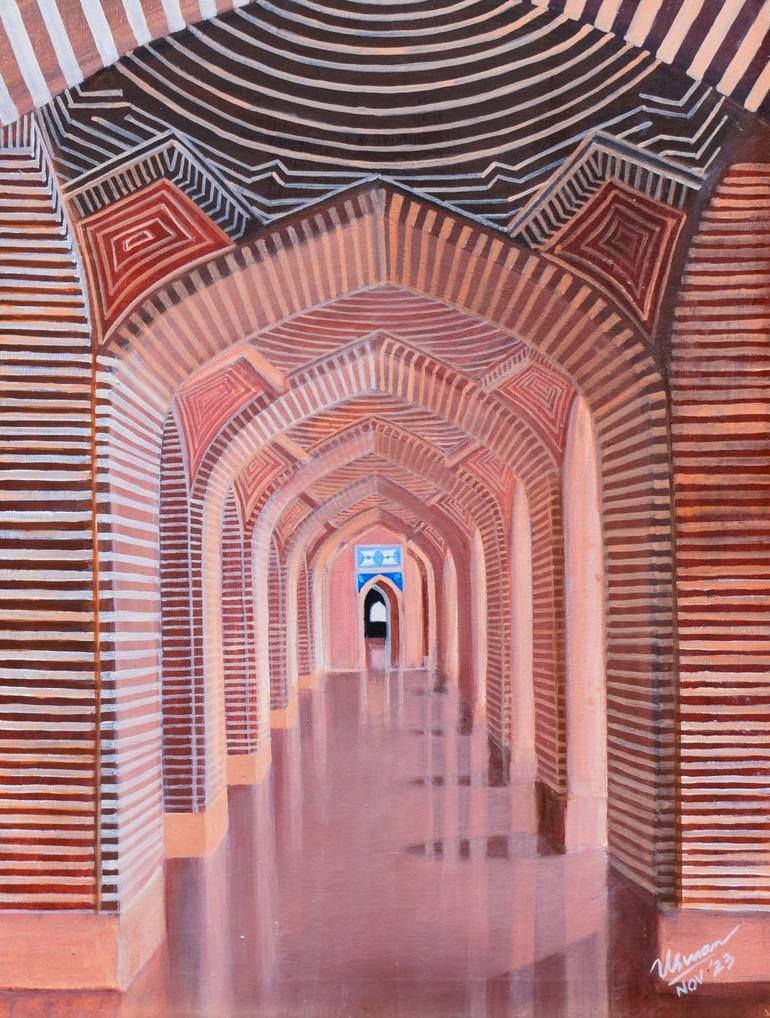 Shahjahan Mosque, Thatta, Sindh, Pakistan. Oil on Canvas, 18” x 24” Patron: Emperor Shah Jahan 17th century Mughal Architecture This exquisitely designed architectural marvel has the most elaborate brickwork and tilework in the entire Indo-Pak subcontinent. The design is a juxtaposition of variou...