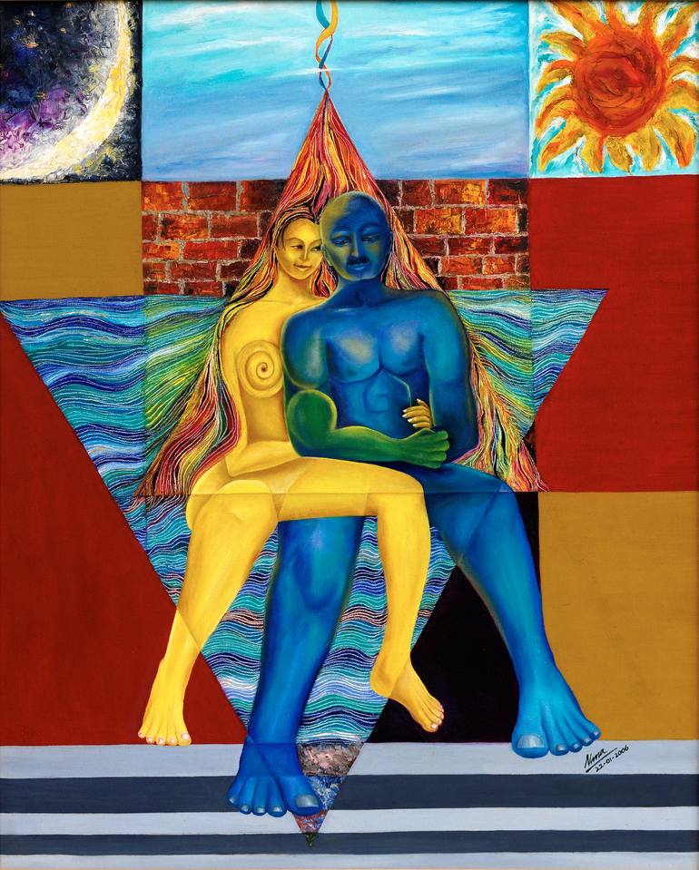 CONCEPT: This painting was meant to start a debate on who is the strength - Man or Woman In Indian mythology Shakti is Lord Shiva’s consort. DETAIL: In this painting, the female is alert and gently lifting the male figure who is engrossed in his ego depicted as his child in his muscular arm. The i...