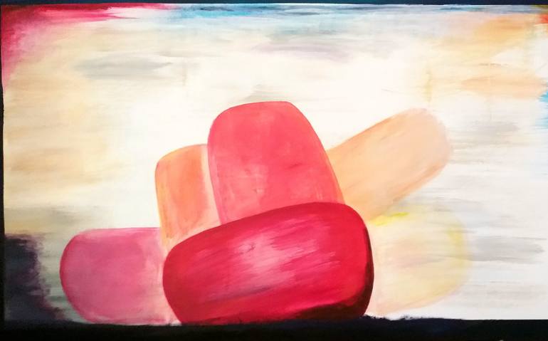 For this work I was inspired by very basic forms, with soft colors in its general composition except for some black and violet edges. I pref3erred to leave enough space between the objects and the background to give the painting air and spaciousness. Signed on the back