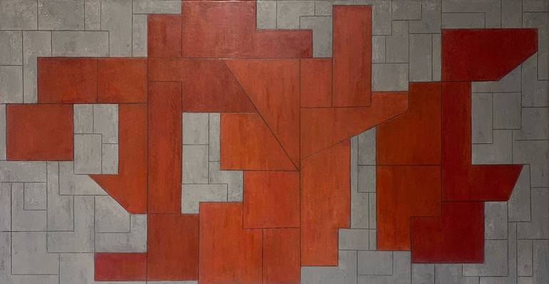 floating shapes on a neutral horizontal background. Primarily a monochromatic painting, the smaller shapes within the larger shape are separated by different tones of the terra-cotta palette. The composition has a Mid-Century Modern feel. oil paint, cold wax medium and marble dust on gallery wrappe...