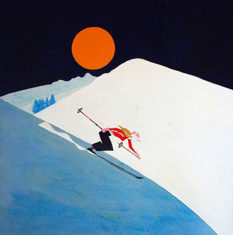 Illustration inspired by the vintage minimalist style, a girl skiing on the snow in the mountains, oil painting on mdf wood. Signed and dated on the back, certificate of authenticity, Mibac certificate. The artwork can be hung without a frame, the edges are also painted.