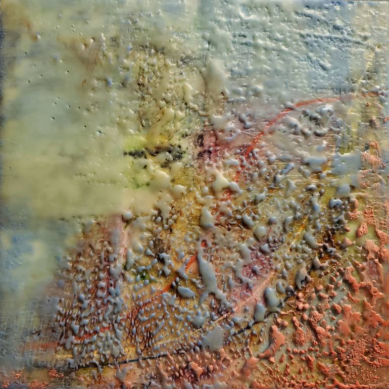 As a response to the corona virus pandemic, this piece represents the impact on American citizens being bombarded news and the discrepancy between facts, statistics, reality and spin, conspiracy theories, deception. The beauty of painting with wax is the many translucent layers built up with the med...