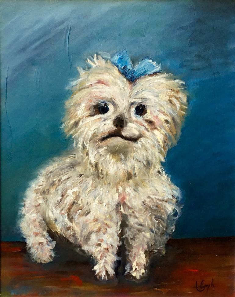 A Cute and Lovely white dog in blue background is standing on the pillow is the symbolic of love, caring and loyalty of the dog’s characteristic. It is the bonding and the attachment between the owner and the dog.