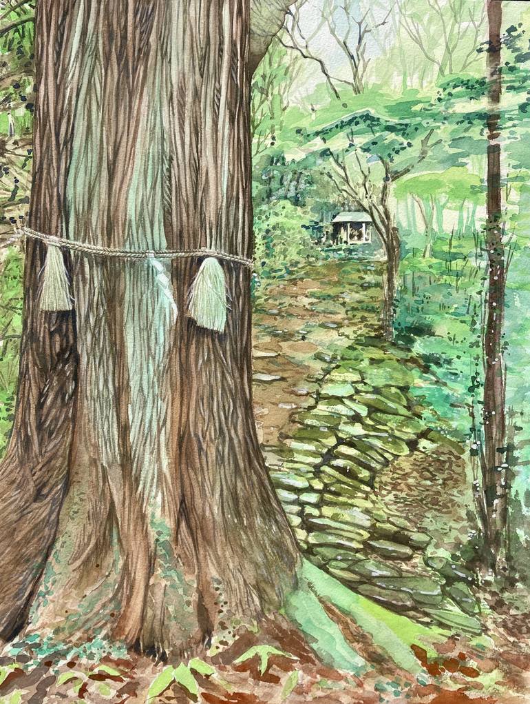 Shimenawa is a sacred rope around a tree and indicates a sacred place. It attracts „Kami“, spirits. The reference photo is from Yoshiko, a librarian from Croatia specialized in Japanese tradition, culture and spiritual places. As I love trees, Japan and forests, this painting comes from my heart.