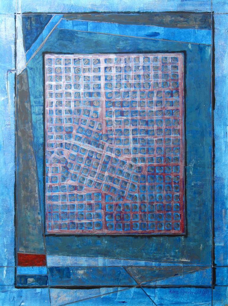 This painting combines a few of my favorite styles and techniques: Midcentury modernist Diebenkorn general style, color blue, metallics, use of graphite in all of the circles in the middle and the lines, a red "stamp", and some geometric shapes. 18 x 24 inches on watercolor paper ships rolled in ...