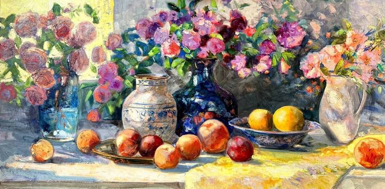 This still life painting portrays a calm, beautiful image of soft golden rays of sunshine hitting tender roses in delicate vases, fragrant plump fruits and silken, golden tablecloth. The image is full of life and beauty, perfect to bring more light to your home. Perfect for enrichment of any living...