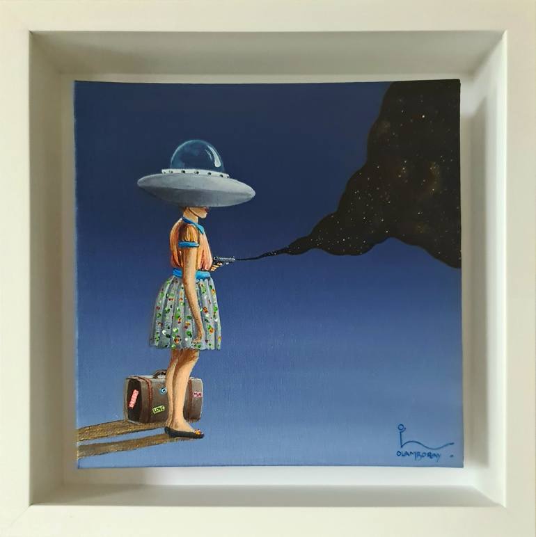The innocence of creation in its purest form as a little girl is spreading stars in the universe, even though the coin has 2 sides,and she is shooting them out of a gun. Her Alien Spaceship hat tells us about outer space life as well and the suitcase for time traveling. Her shadow is golden as she i...