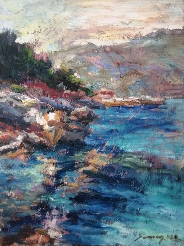In the big tradition of painting the motive of water always takes a special place. In this painting the two total oppositions are rock coast and the life of dynamic water, which is especially colorful..The motive of water gives a challenging and inspiring painting occupation. One of heaviest effect...