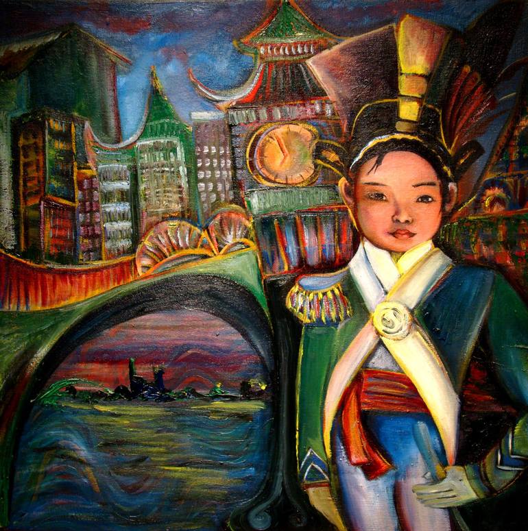 It's (almost) seven o'clock. The emerald bridge comes alive above the river reflections. The girl in parade garb is waiting, poised, still, aglow and unreadable. Expressionistic, fantastic, emotional, swaying with the waves.