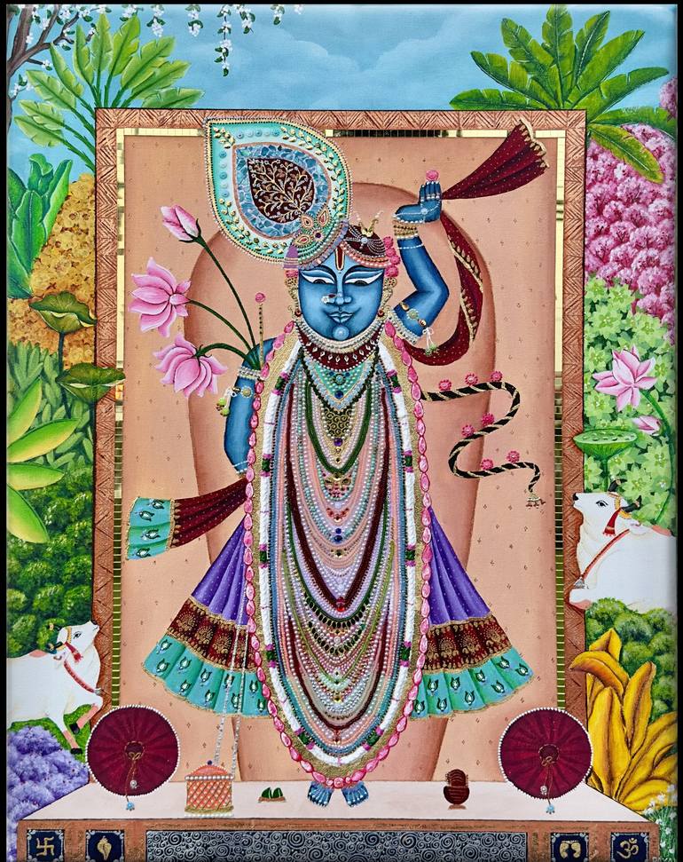 Original handmade artwork inspired by Indian sacred art, created with beads, stones, mother of pearl, and golden mirror work. This artwork, titled Divine Presence, was originally created as a custom order for a client who wanted a spiritual and visually rich portrait of Shreenathji — a revered form...