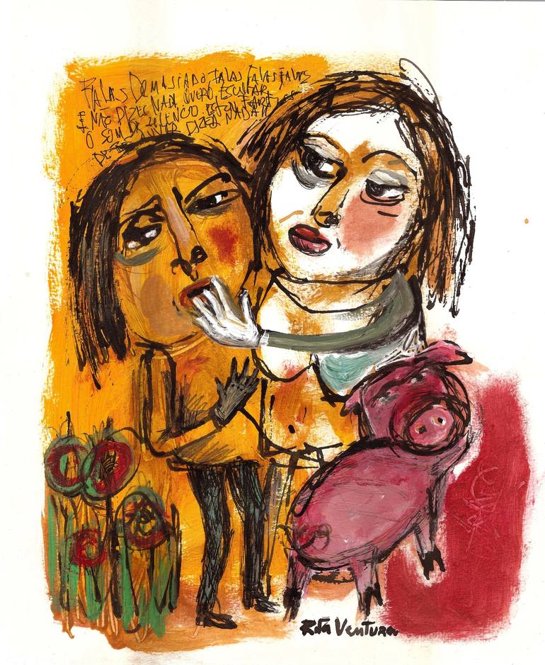 Rita Ventura is a Portuguese plastic artist who creates a vivid and expressive universe filled with characters and animals who confront each other to depict - and often to denounce - modern life. Inspired by Lisbon, its artistic tradition and the magnificent light, Rita’s work is irreverent, ironic, and funny – yet her pertinent depictions of moral and social problems, notably in the female world, are provocative. Rita studied at IADE- Criative University, Design course and painting course under the guidance of master Lima de Freitas. She also worked as a creative person for RTP and LPM communication. Rita participated in the 1st SIAC - International Contemporary Artists Salon, at the Oeiras Foundry and at the Monsaraz Biennial. She has held several solo exhibitions and is present in several private collections in Portugal and abroad. Rita’s themes and style have many people associate her to the Outsider Art movement - but her incorporation of expressionism and satirical illustration make her an original and contemporary artist.