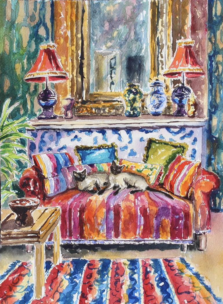 An original interior watercolor and permanent ink painting of 2 Siamese carets lounging on a colorful sofa. Painted on Arches, French-made all cotton 300gsm paper with Rembrandt watercolor paints so you can enjoy your artwork for a lifetime. This painting comes with a certificate of authenticit...