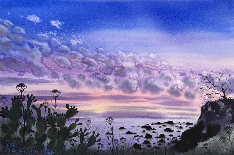 La piccola ma bellisma città AciCastello in Sicilia sempre nel mio cuore…. Cactus. Fico d’india. Sicilian hirbs. Colorful clouds on the sky. Black volcanic rocks. Black volcanic stones in the lilac waves in the Mediterranea. Coast of paradise. Sicily. Italy This watercolor painting was painted u...