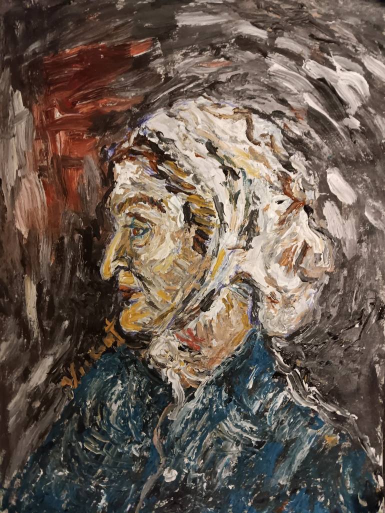 Sien with white cap. From the drawing of Van Gogh. Painted in 2015 with inspiration from the essence of Vincent. Conjured from the spirit world. Not from the Netherlands, but from the Netherworld. Vincent is glad, that he can still express himself. He wants to say HI, to all of you. You can migh...