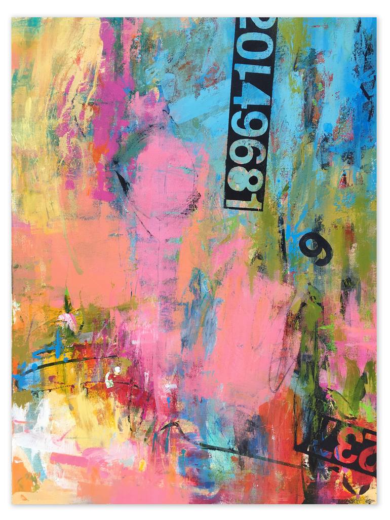 This piece is part of my "Texting While Painting" series. Incorporating the high contrast "text", in this case positive and negative image numerals, adds the "punctuation" I desire to consider a work finished. The appearance of a strip of vinyl lettering, is actually all acrylic, trompe l'oeil paint...