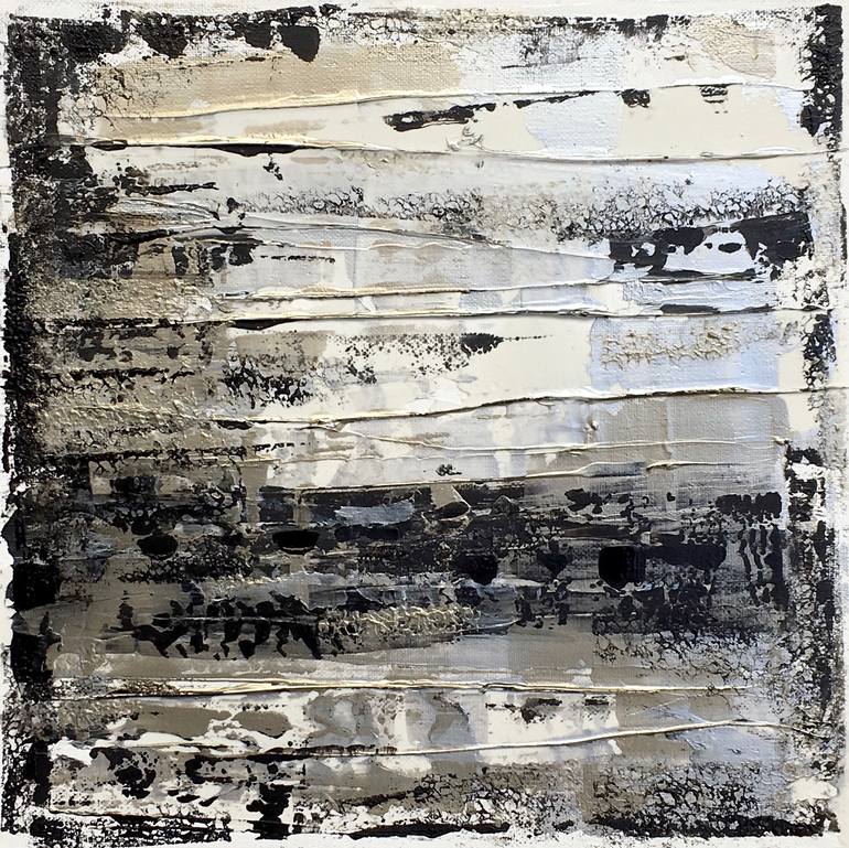An impression of a landscape using neutral colours: black, cream, silver and pewter. Because the latter two are metallic and have a sheen, the painting changes character according to the source of light. The painting is framed in a white satin float frame, and is ready to hang. Size indicated is f...