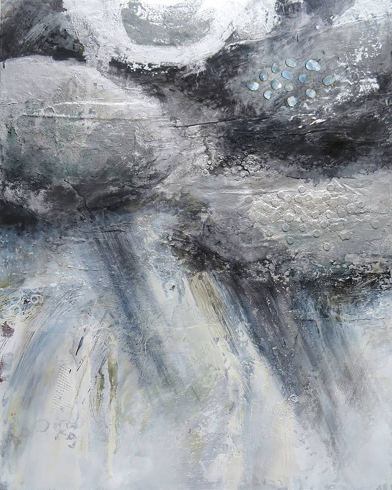 This piece is part of my “Clouds” series. Living in a northern country has compelled me to appreciate the beauty of clouds. I especially love the stark contrasts of illuminated storm clouds. This mixed media painting combines collage elements, acrylic paint, silver leaves, aluminium pieces and oil p...