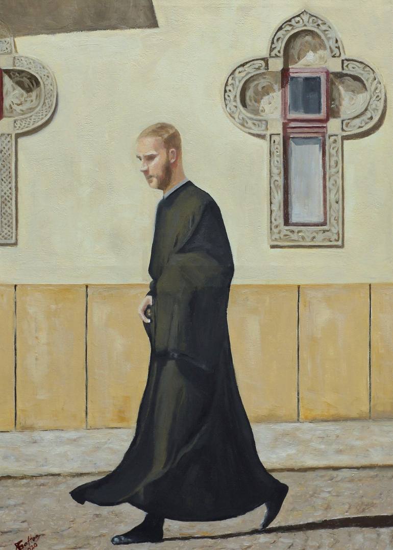A scene from the courtyard of Sinaia Monastery in Prahova county , Romania. Inspired by how much the demeanor of the young monk walking can express...