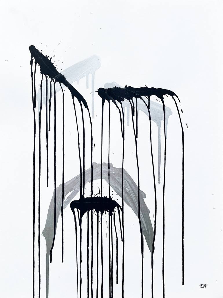 This thought-provoking artwork is a testament to the power of simplicity and emotional expression. Set against a stark white background, it features a series of bold and flowing black and gray paint drips. The artist employs gravity as a collaborator, allowing the paint to cascade down the canvas, c...