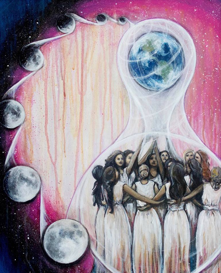 “Sister Circle” by Carrie Martinez More and more women are coming together to bring love and healing to the planet and all beings. Channeling the energy of the moon and the Earth, they are able to create energy and power. They are embodying the Goddess, working together to create magick and manifes...